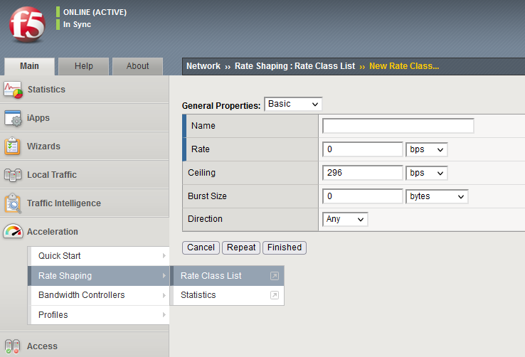 Sur n’importe quel VS, il est possible de mettre en place du traffic shaping (limiter le débit max entre autre). Pour cela, il faut créer une nouvelle Rate Class en allant dans Acceleration > Rate Shaping > Rate Class List et en créer une nouvelle: